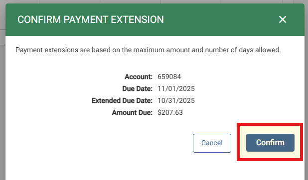 It will automatically populate the past due amount and the latest arrangement date possible. As long as the past due payment is received by the end of the date listed as the Extended Due Date, your services will not be disconnected. Click "Confirm" to set your arrangement.
