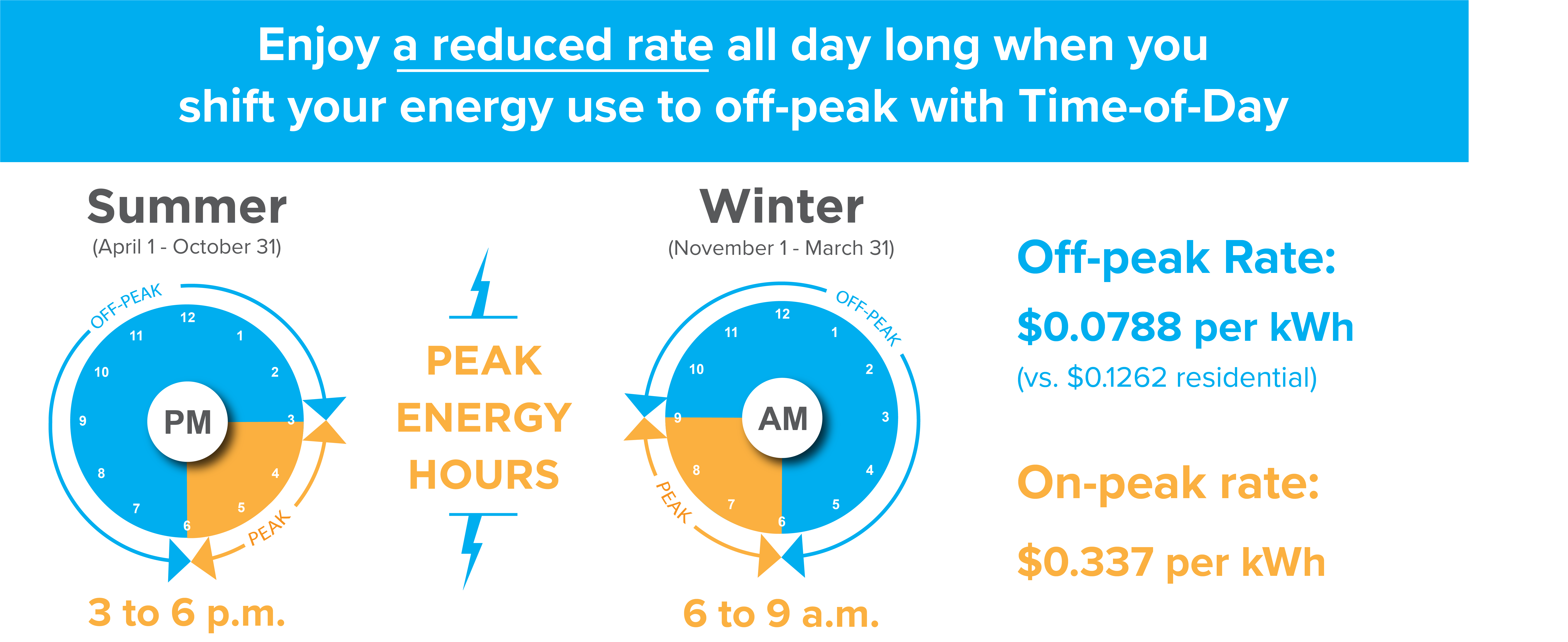 Our Time-of-Day rate (TOD) is a voluntary program that rewards members with a lower electric rate for shifting energy-intensive tasks - such as laundry, cooking and heating/cooling-- away from peak hours. Peak hours are the few hours each day where demand for electricity is the highest and most expensive.