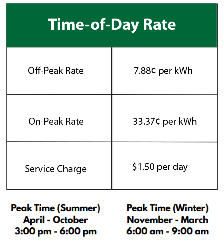 Members choosing to move to the Time of Day (TOD) rate will be required to sign an agreement to participate for one full year. That is because the amount of savings changes in winter and summer months due to demand so the total savings is determined ...